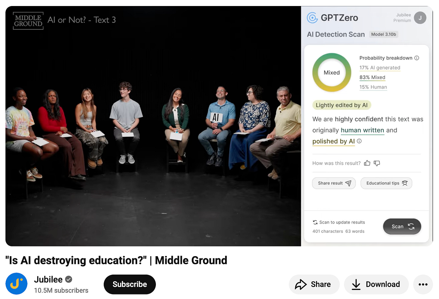 In Jubilee Media’s latest episode, “Teachers vs Students: Is AI Destroying Education?”, students and teachers sat face-to-face to read passages aloud, guessed which ones were written by humans and which were written by AI and then checked their instincts using GPTZero.